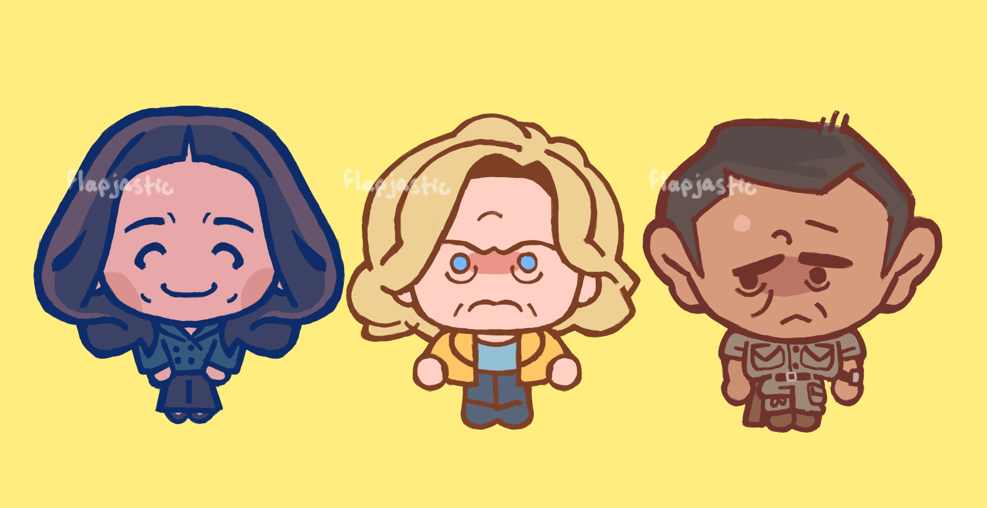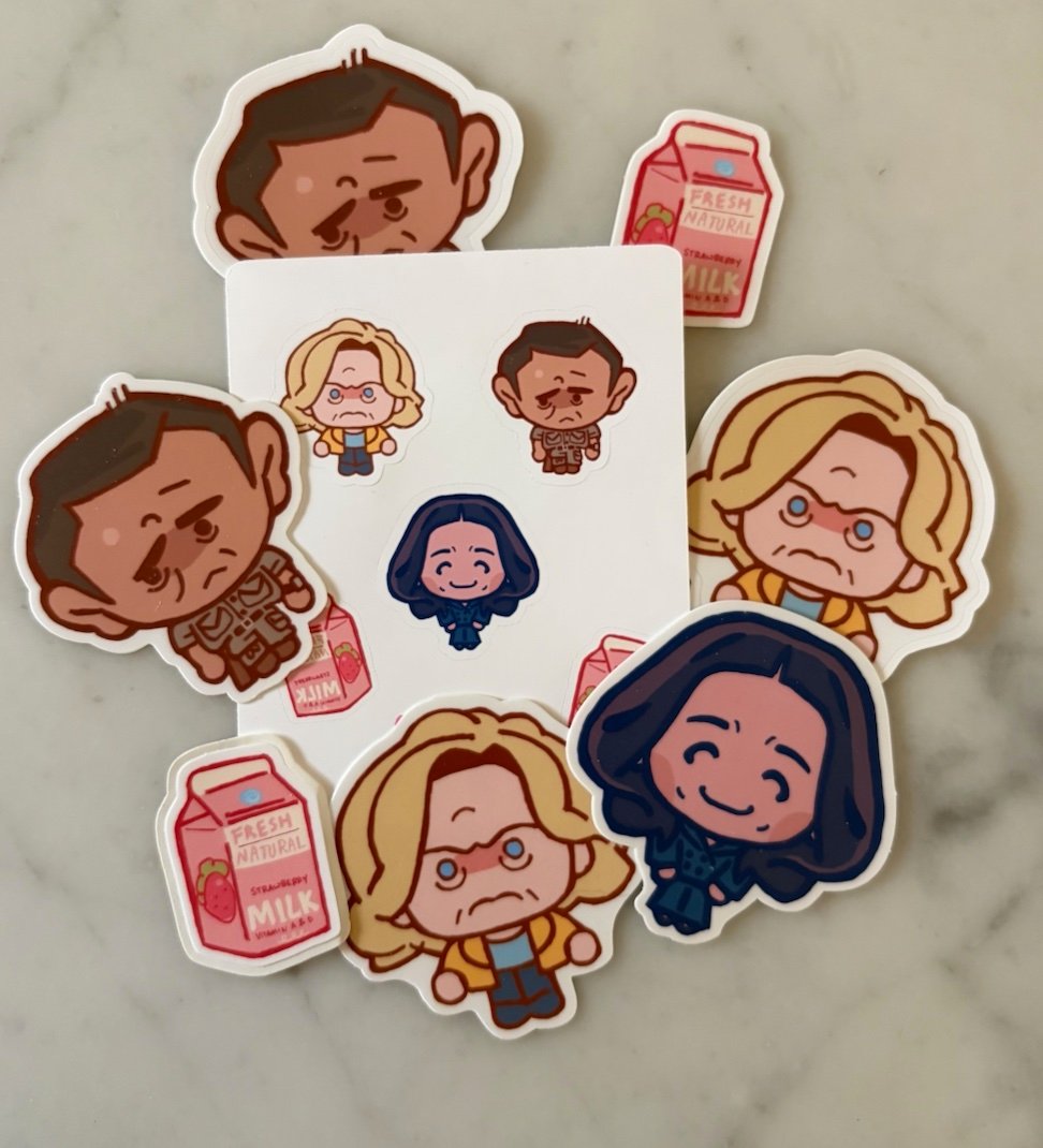 Stickers of the Pluribus cast - Carol, Zosia, and Manousos, each 2” tall, HDP (1.35"). Each pack comes set of 4 die cuts, easy-peel set, and a small sticker sheet (1" tall")